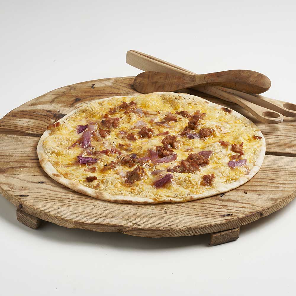 Nuestra pizza Ranch, otra combinación summum de Squizzita. Sobre nuestra masa madre de lenta fermentación añadimos mozzarella, cheddar, pollo asado, bacon y cebolla morada, todo acompañado de salsa ranchera. Suena increíble, y está deliciosa… ideal para los gustos más exigentes.